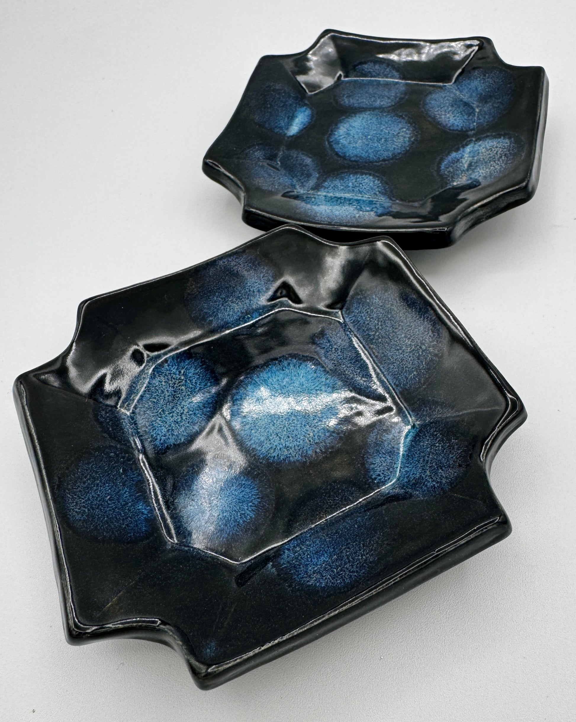 The Blue Note Duo captures cool sophistication through the Frozen Pond technique, where light and reflection dance across each dish in mesmerizing patterns. These pieces blend artistic elegance with functional beauty, creating trinket dishes that are a visual delight. A perfect gift as a set or as individually.