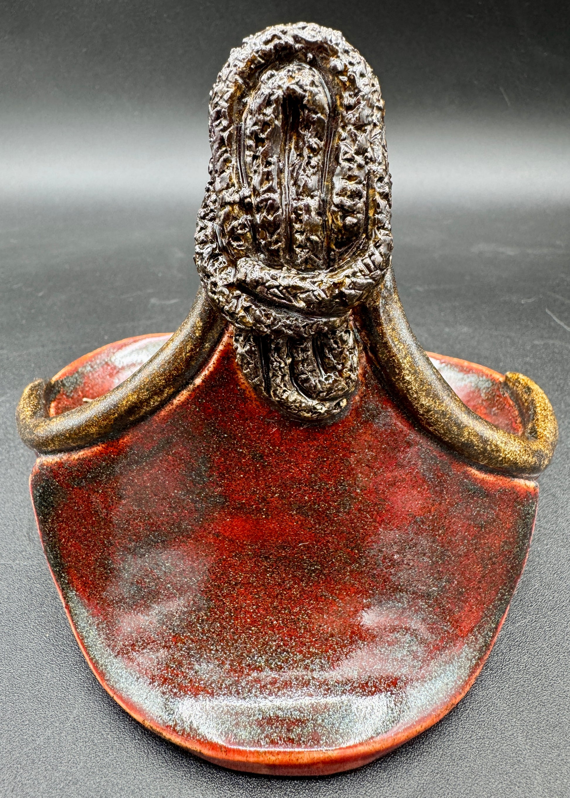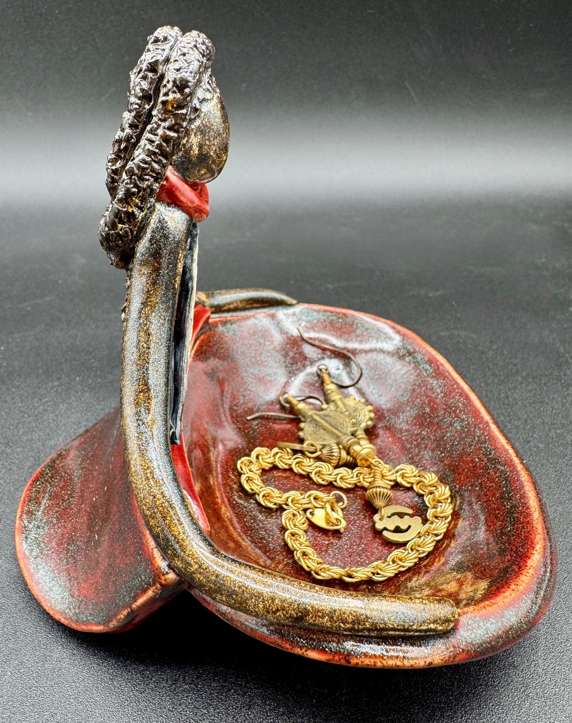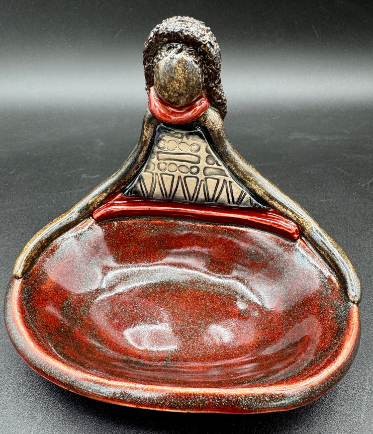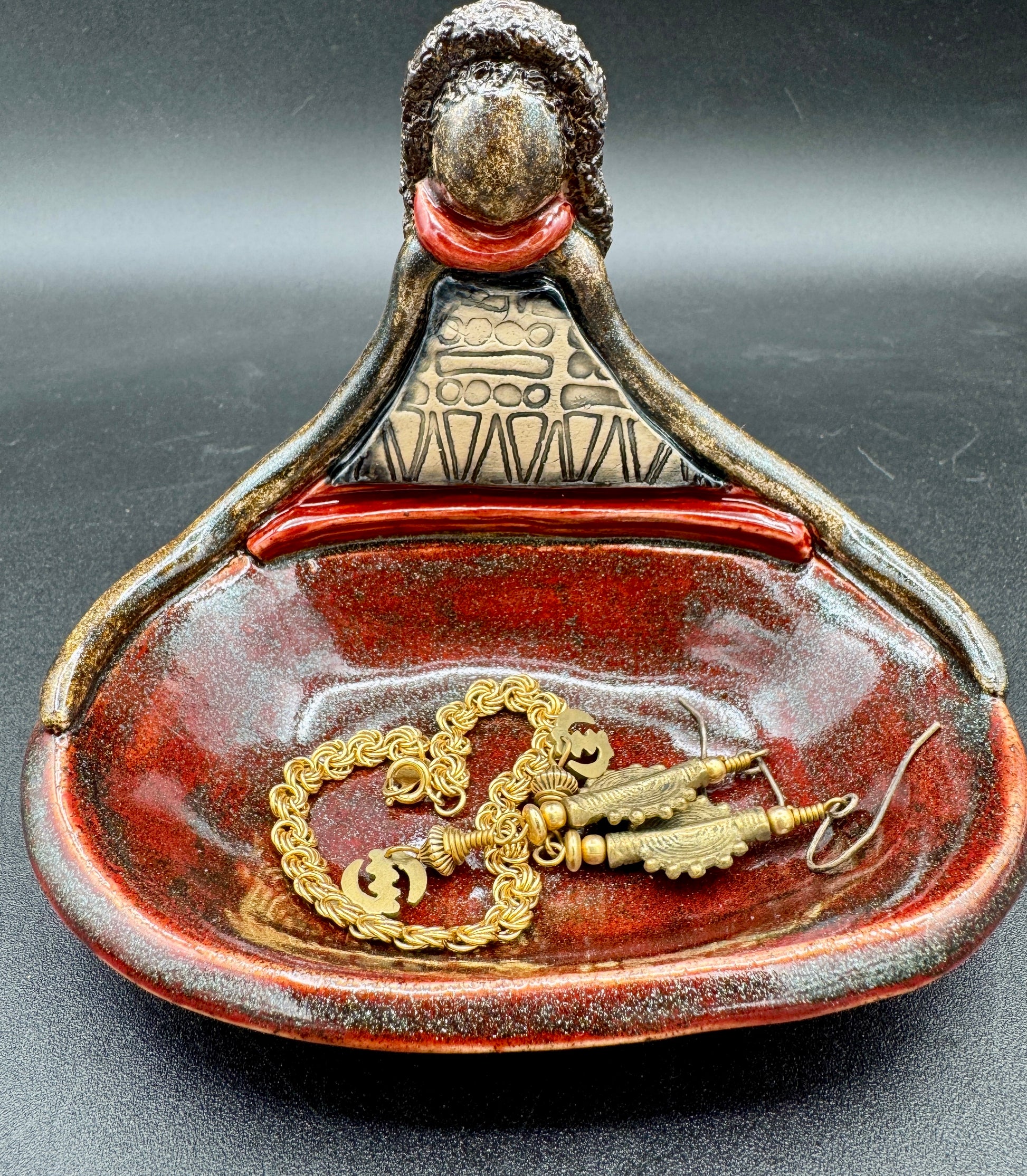 Bold Grace, commands attention in rich, deep red with shimmering bronze undertones. Her intricate textured hair wraps in a sculptural crown of confidence, symbolizing beauty and resilience. She'll hold your treasures beautifully!