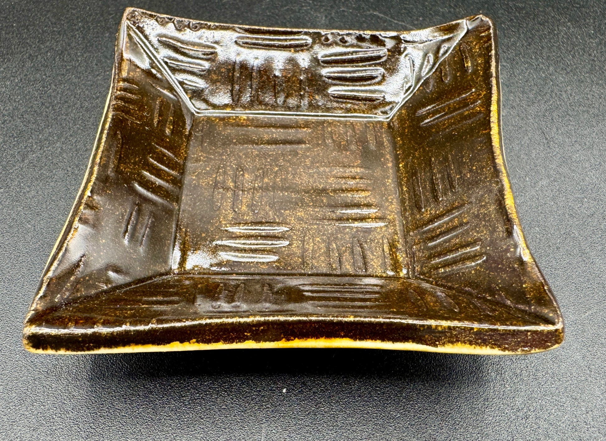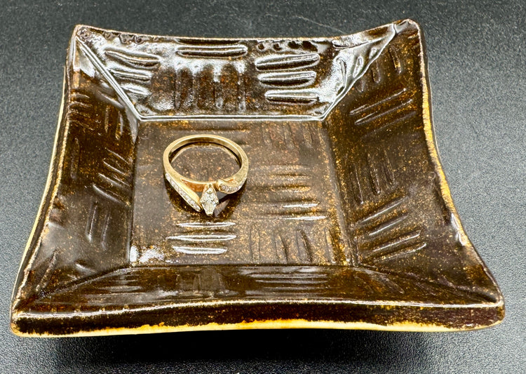 A petite ceramic dish with earthy charm, perfect for corralling your favorite small treasures. Its deep brown glaze and subtle mud cloth-inspired pattern add understated elegance to any shelf or nightstand. Whether you're stashing jewelry, coins, or keepsakes, this little gem keeps what matters close at hand—with a touch of artisanal flair.