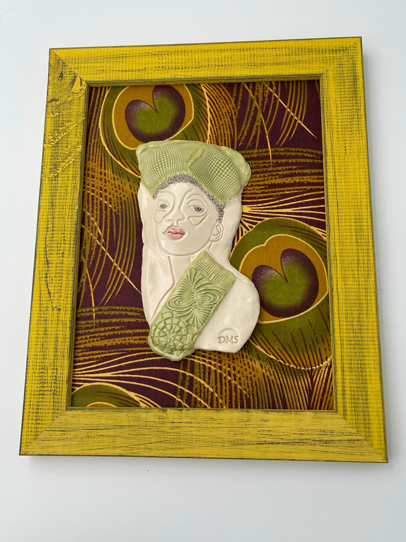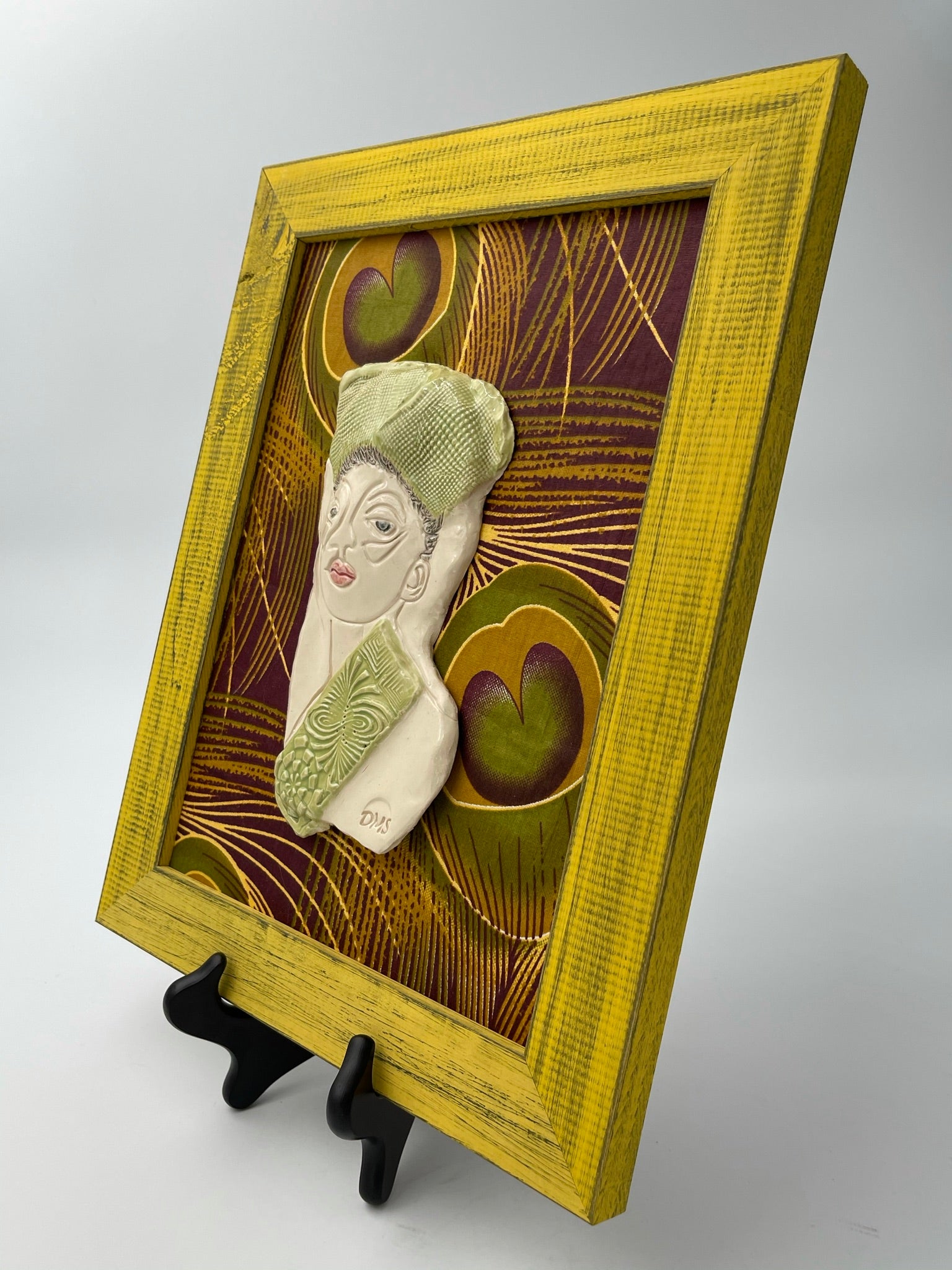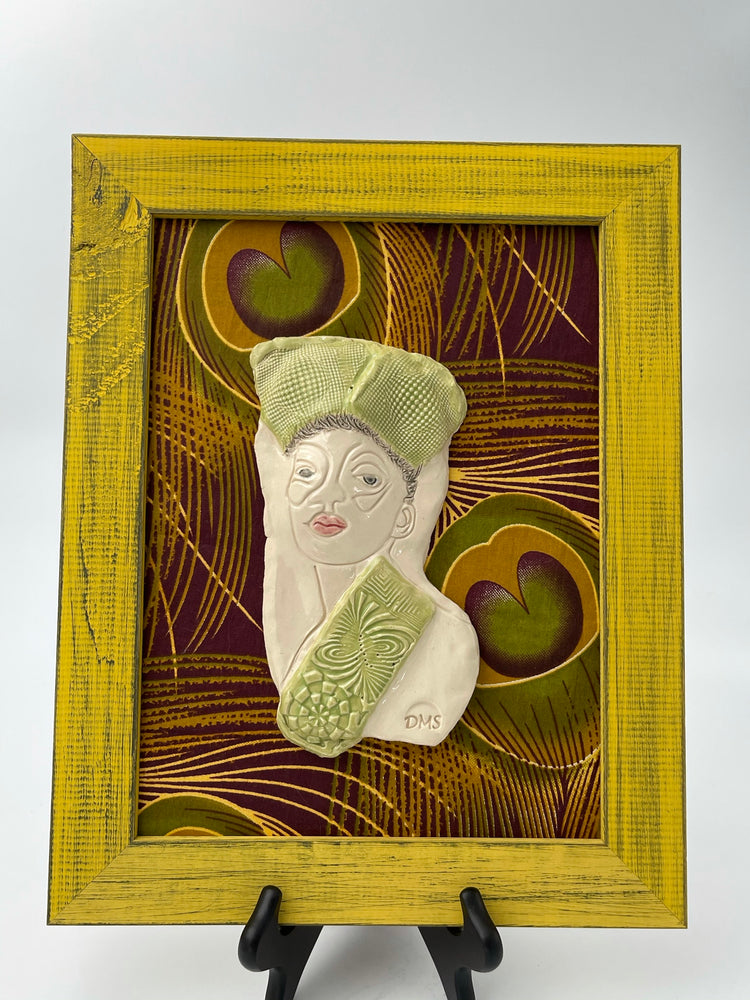 This pretty woman is backed by a peacock patterned fabric in a bright yellow frame!