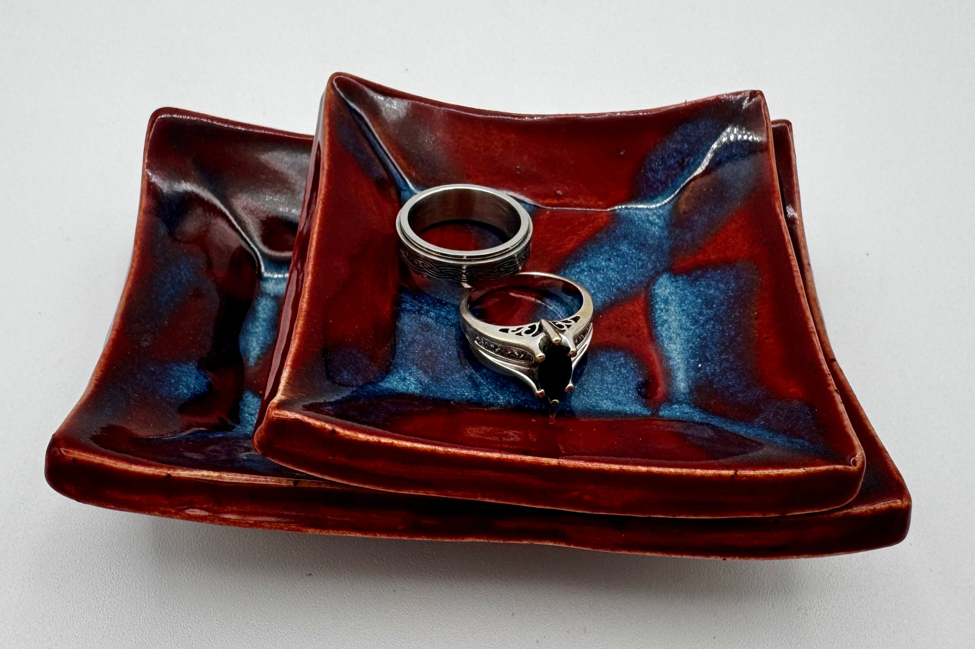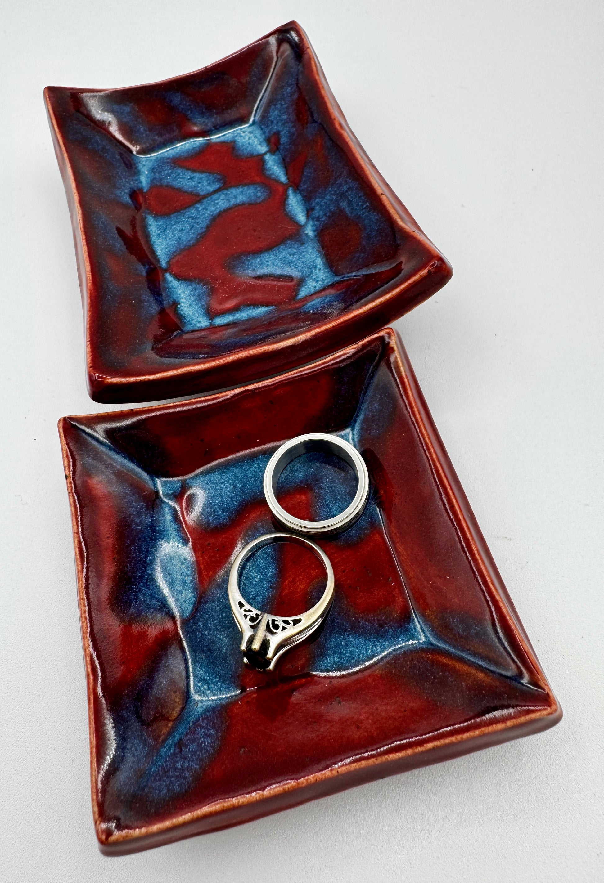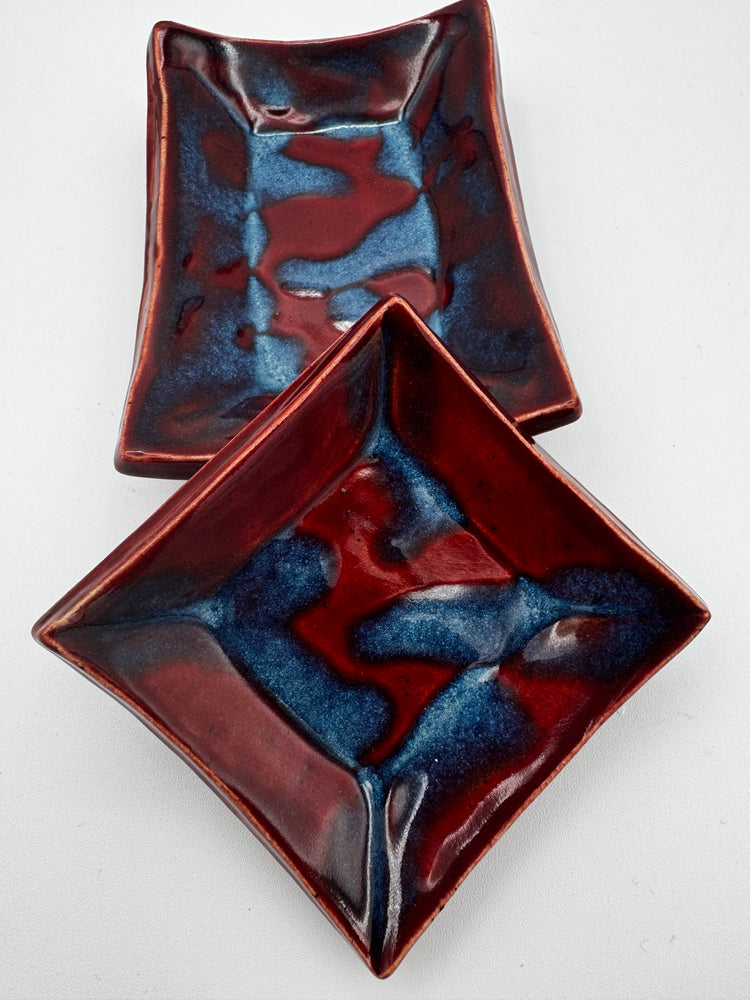 Fire meets ice in this enchanting duet of trinket dishes! Vibrant red and cool blue hues collide in a mesmerizing dance, creating a magical contrast that brings joy to any space. Perfect for holding jewelry, keys, or small treasures, this dynamic pair celebrates the beauty of opposing forces in perfect harmony. A playful accent that sparks conversation and wonder.