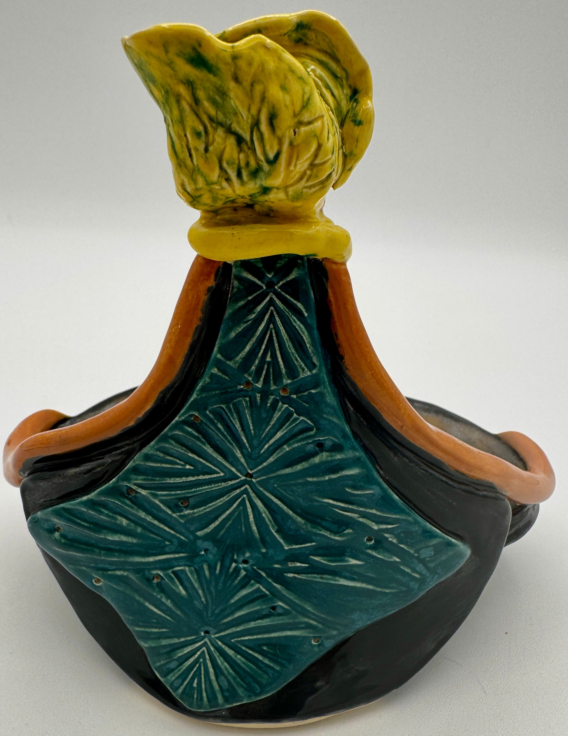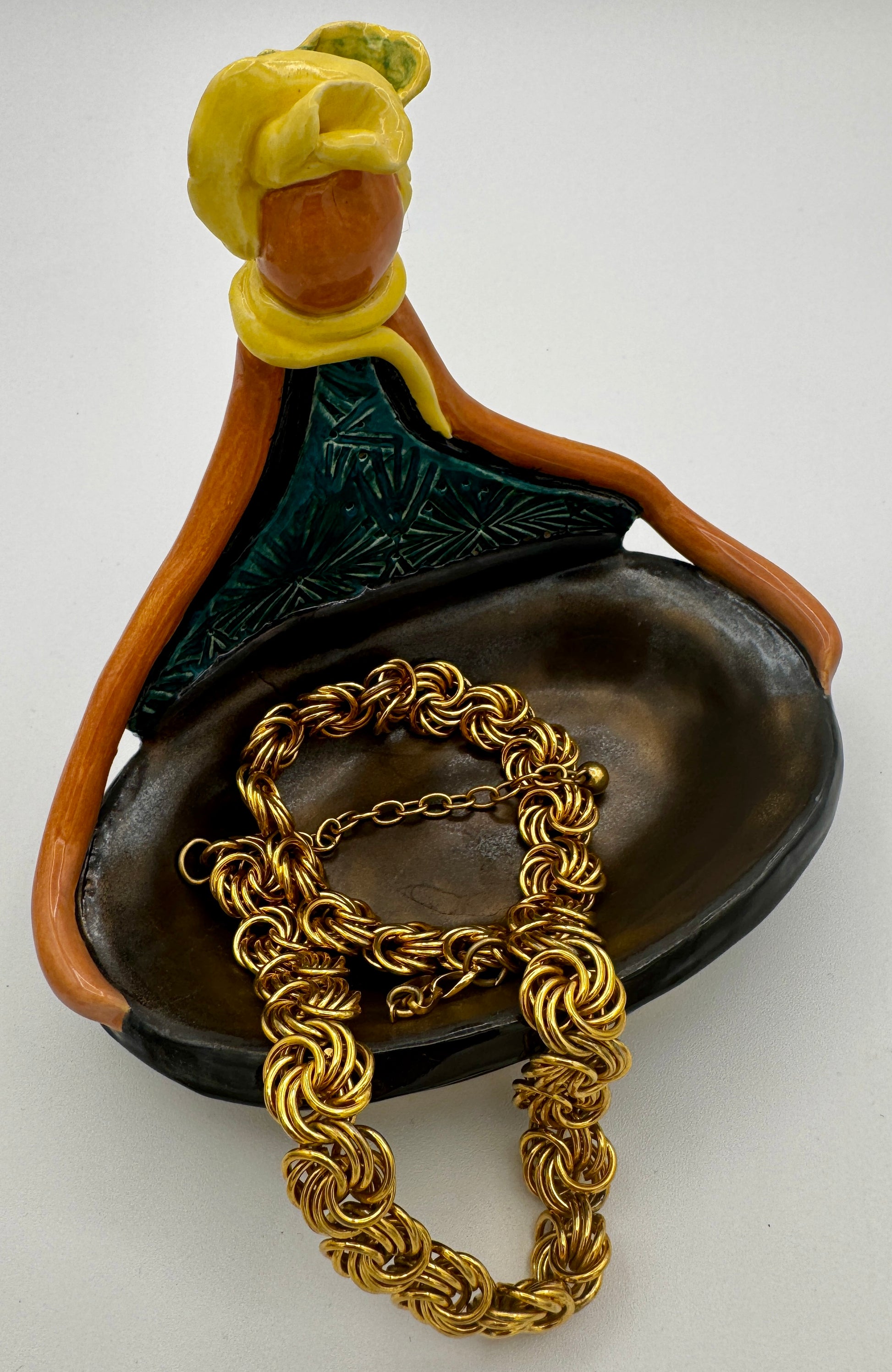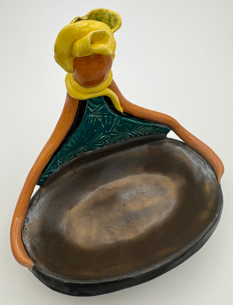 Ocean’s Embrace captures the serenity of deep waters and the power of the feminine spirit. Layered glazes of teal, bronze, and cream merge like tide and sand, while her sculpted hair and textured bodice evoke balance and grace. A perfect vessel for your small treasures!