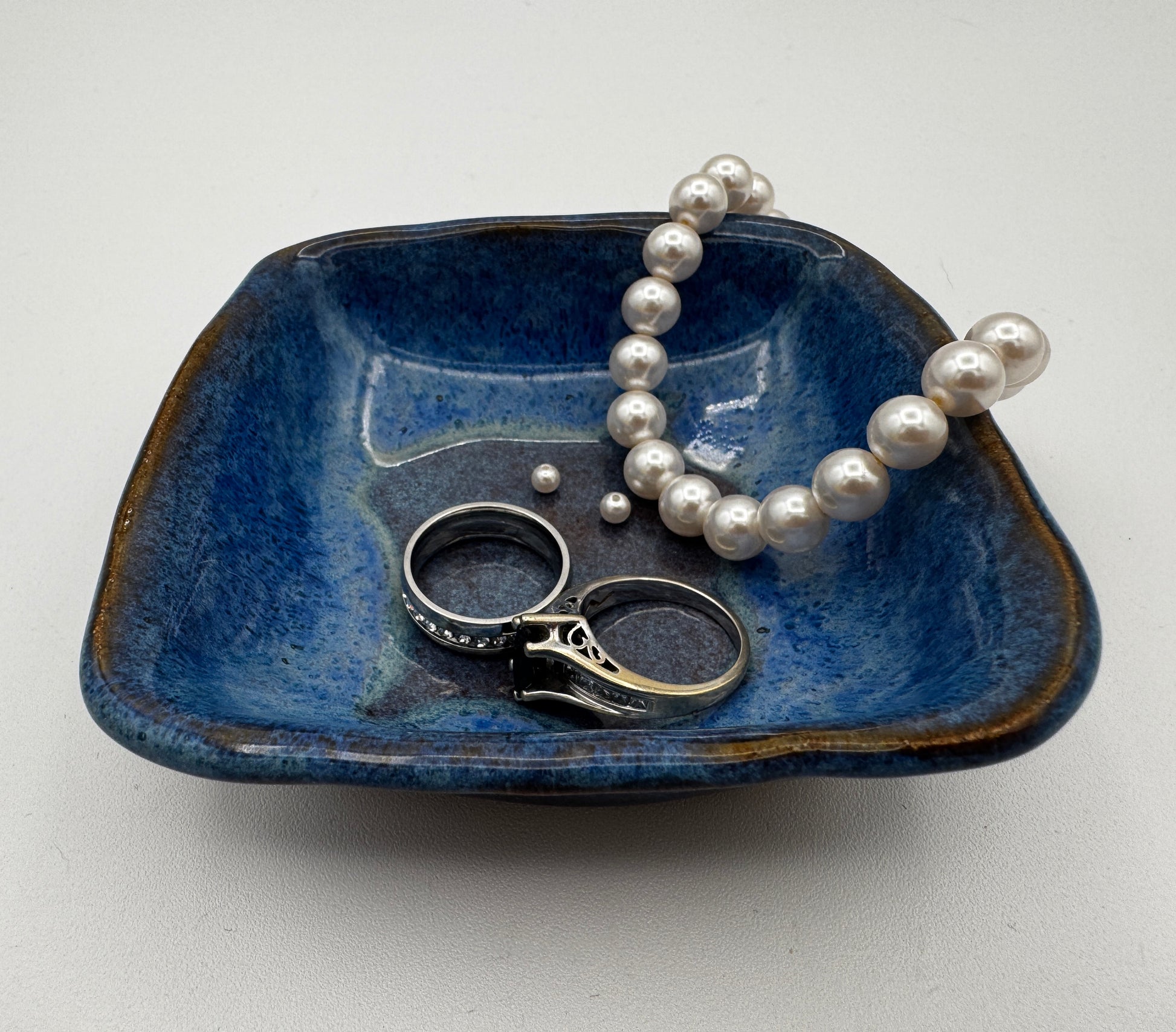 A soft-edged square dish that shimmers with deep blue tones and calm, coastal vibes. Ocean Whisper keeps small treasures grounded in serenity.