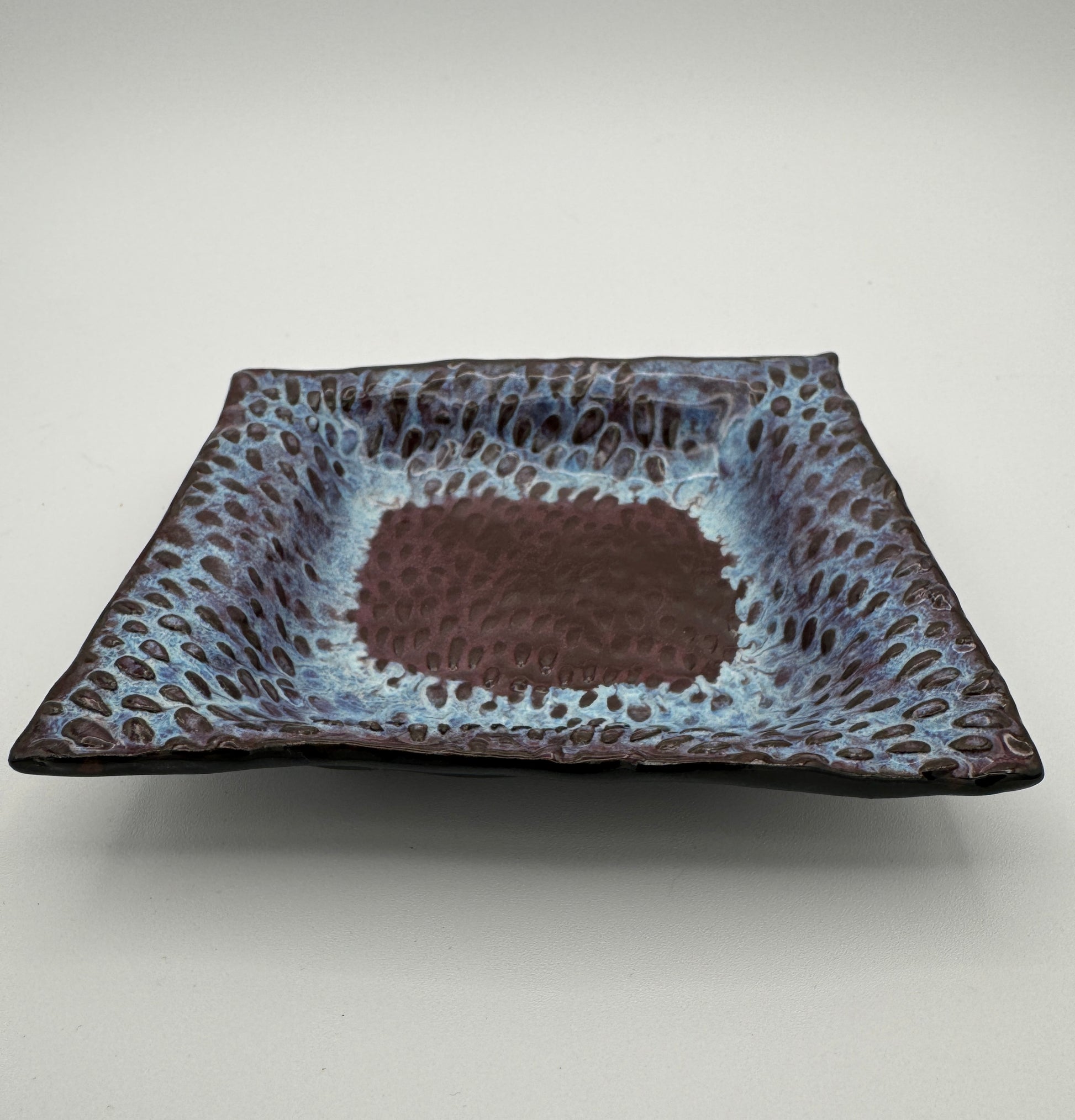 This colorful little dish is a real multitasker - use it to hold your trinkets or serve up small treats. Its lovely blue and purple hues make it a delightful addition to any space. Pretty, practical, and perfect for any occasion.
