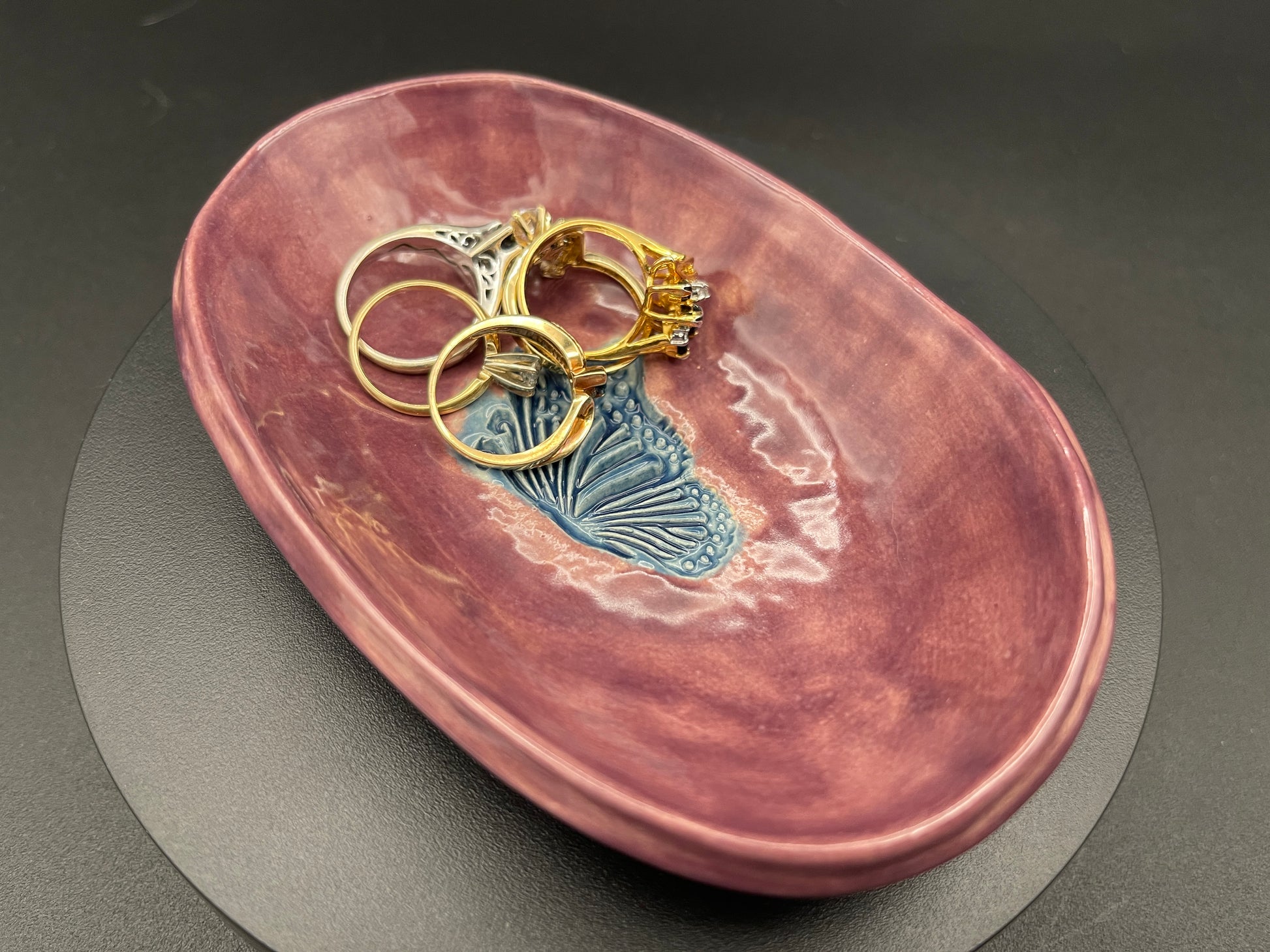 This Trinket Dish is the perfect place to put your precious possessions! It's small enough to fit on any dresser but sturdy enough to keep all your trinkets safe. Plus, the blue butterfly in the center adds a touch of whimsy! (Because why would you want your jewelry to look boring?)